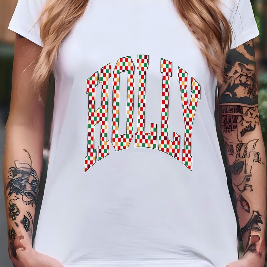 Checkered Retro Holly Sweatshirt, Merry Christmas Sweatshirt, Festive Holiday Sweater, Cute Christmas Gift, Varsity Aesthetic Xmas Crewneck T-shirt