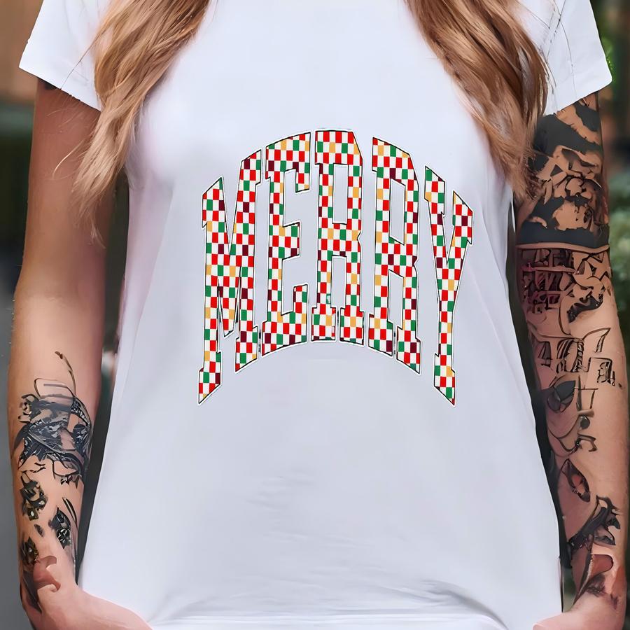 Checkered Retro Merry Sweatshirt, Merry Christmas Sweatshirt, Festive Holiday Sweater, Cute Christmas Gift, Varsity Aesthetic Xmas Crewneck T-shirt