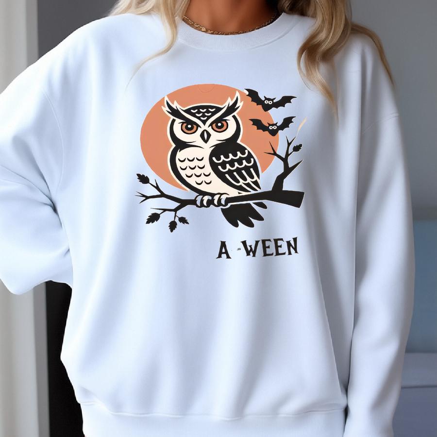Spooky Owl Halloween Gildan Sweat Shirt, Cute Costume Pumpkin Tee, Spooky Season T-shirt, Unisex Ghost Aesthetic Fall Shirt Sweatshirt