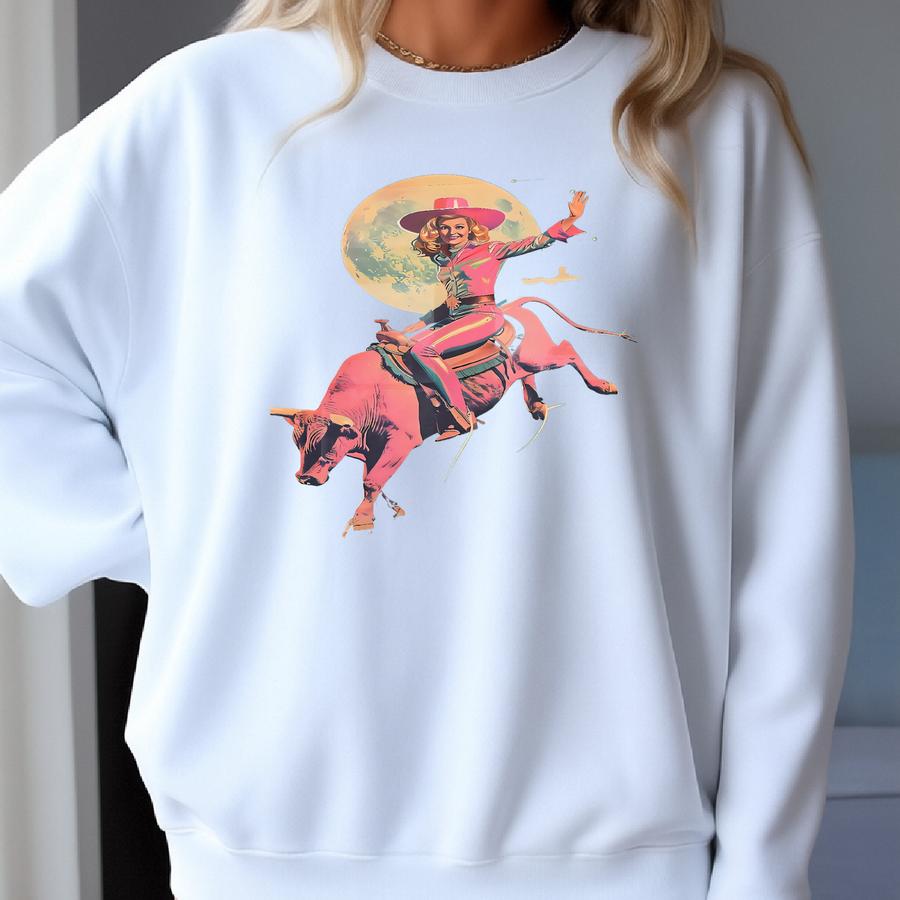Pink Retro Cowgirl Riding Bull Art Print | Cosmic Cowgirl Wall Art, Vintage Rodeo Cowgirl Art, Surreal Southwest Western Desert Art Prints Sweatshirt