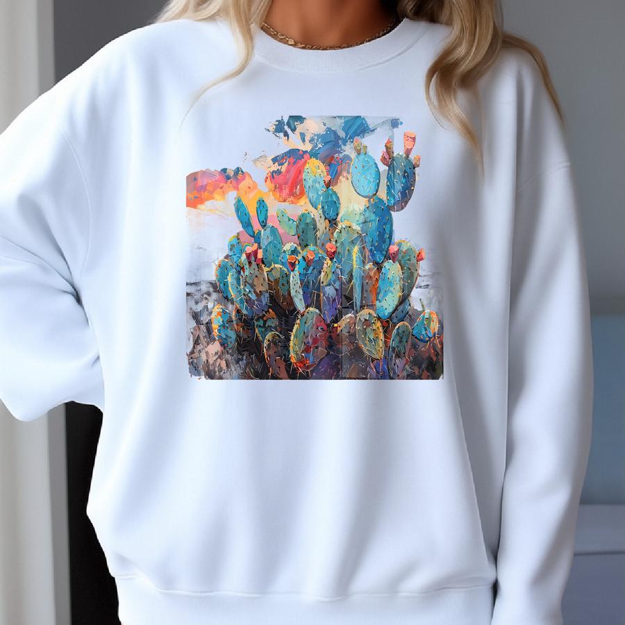 Ly Pear Cactus Art Print | Cactus Painting Wall Print, Colorful Western Art, Southwest Desert Landscape Sunset Print, Cowboy Wall Decor Sweatshirt