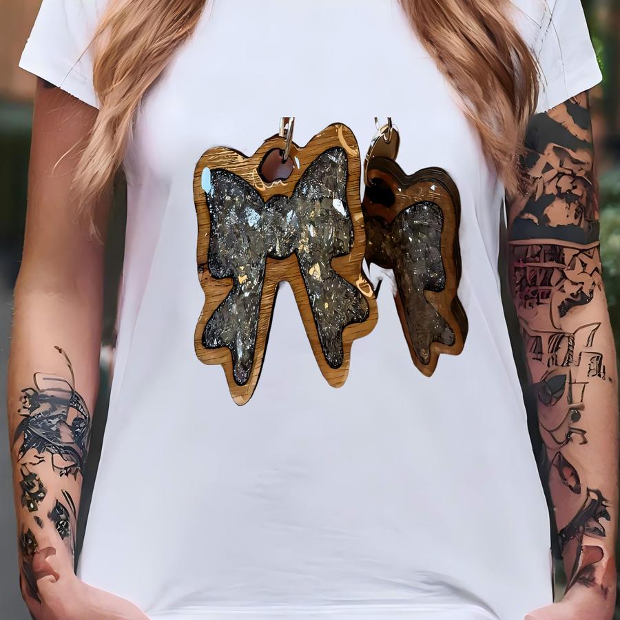 Earrings-bow, Wooden Bezel Shimmer Silver Resin T-shirt