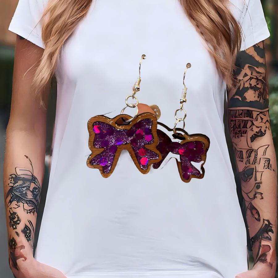 Earrings-bow, Wooden Bezel Shimmer Deep Pink Resin T-shirt
