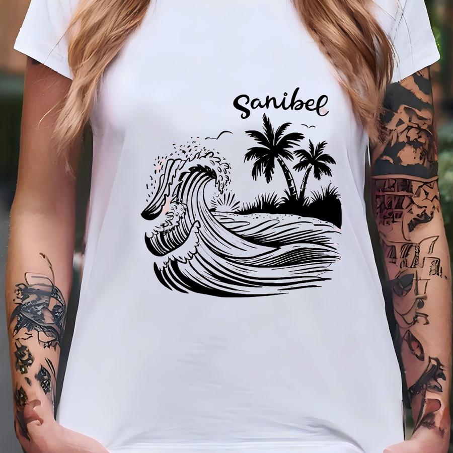 Sanibel Florida Hand Drawn Beach Palm Tree Design Casual Unisex Hoodie T-shirt