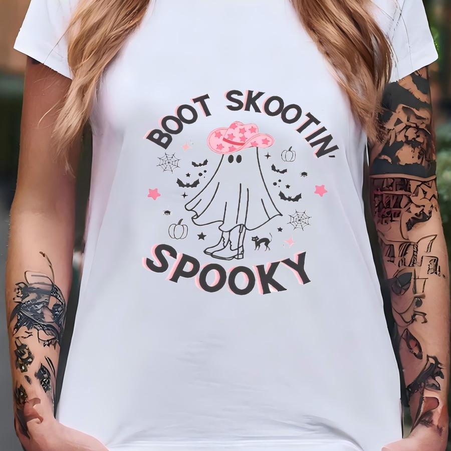 Boot Scootin Spooky Shirt, Halloween Shirt, Western Halloween Shirt, Cowboy Ghost Shirt, Fall Clothing, Halloween Gift, Pink Western T-shirt