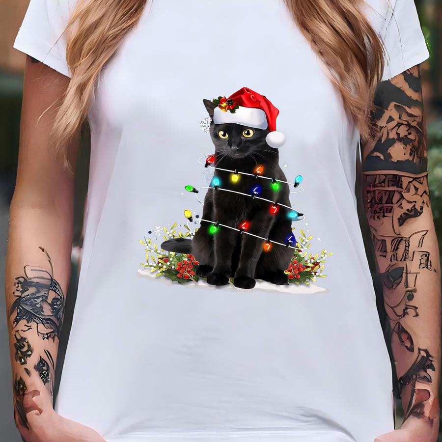® Black Cat Christmas Shirt, Christmas Lights Holiday Hoodie T-shirt