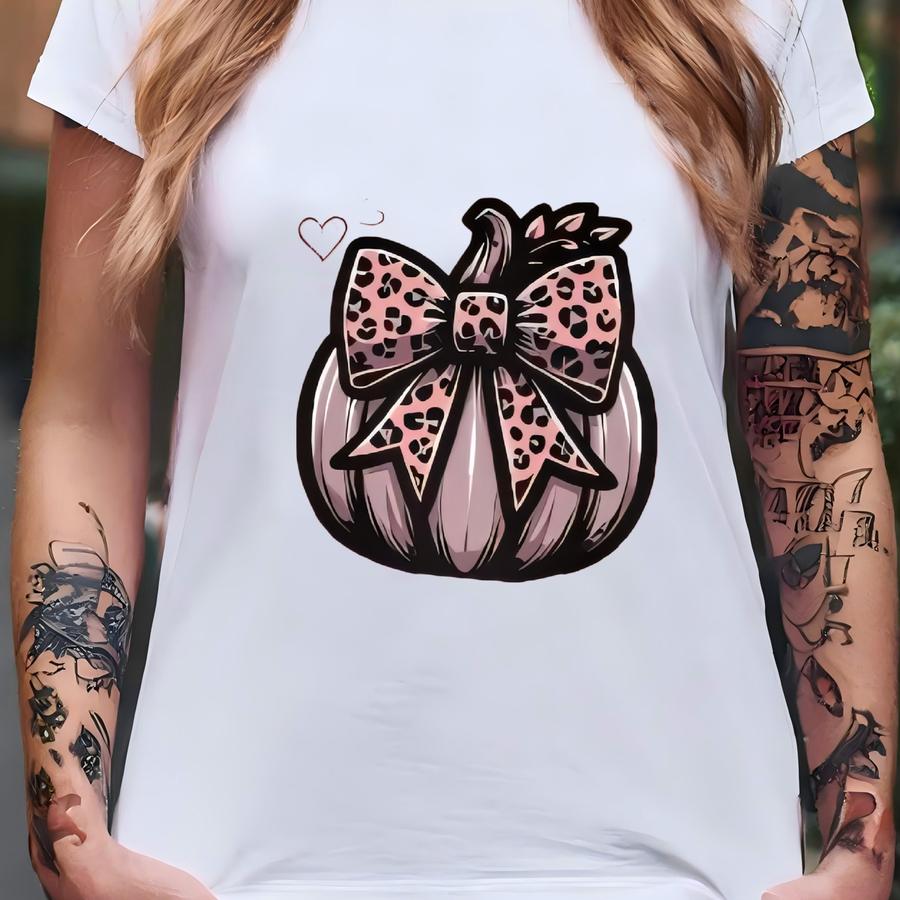 Coquette Pumpkin Sweatshirt | Leopard Bow Pumpkin Shirt | Pink Fall Aesthetic Tee | Cute Halloween Shirt | Spooky Season Crewneck T-shirt