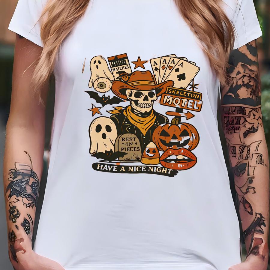 Cowboy Skeleton Halloween Sweatshirt | Retro Spooky Ghost Pumpkin Motel Graphic Pullover | Creepy Fall Sweater | Have A Nice Night Tee T-shirt
