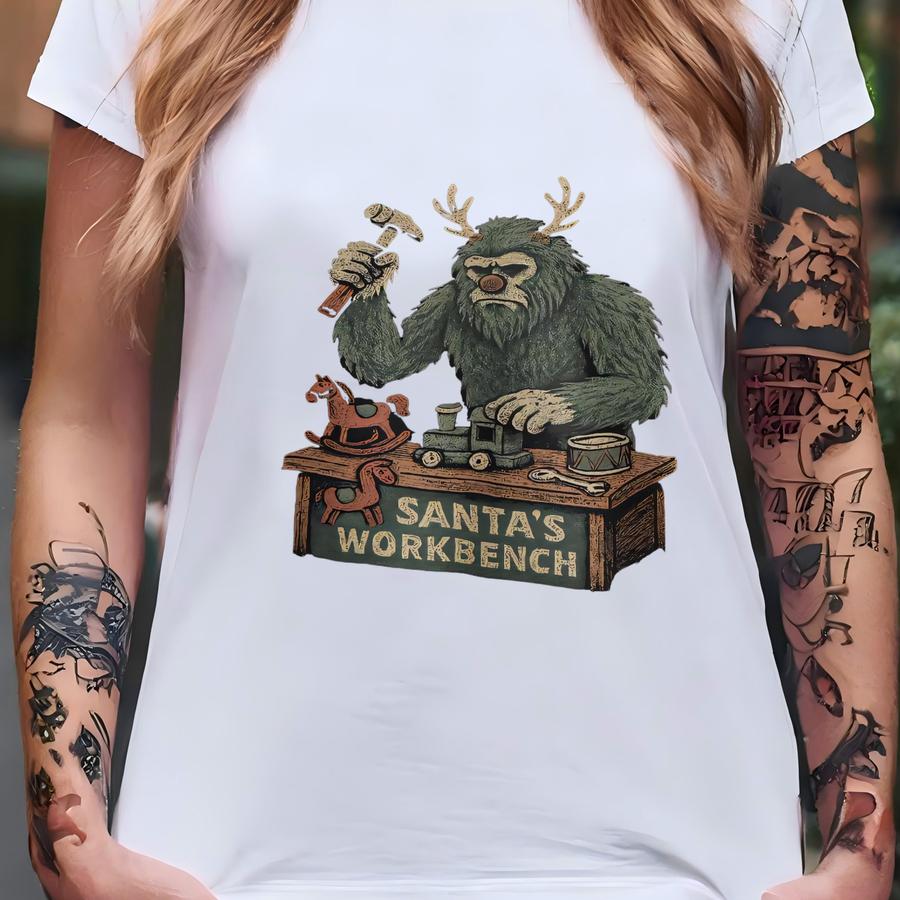 Bigfoot Christmas Sweatshirt | Santas Workbench Funny Holiday Cryptid Sweater | Adult And Youth Sizes T-shirt