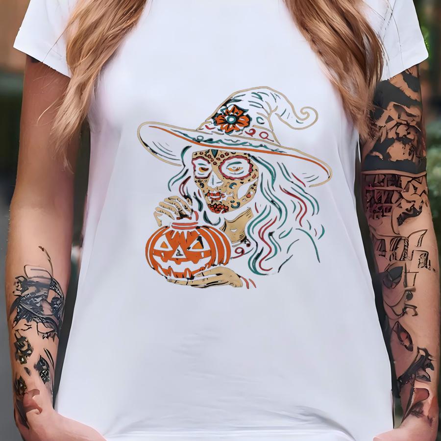 Sugar Skull Witch Halloween Shirt | Day Of The Dead Pumpkin Tee | Adult And Youth Sizes T-shirt