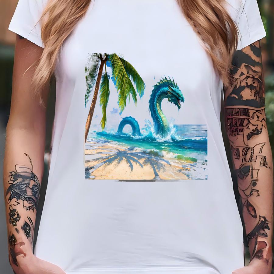 Sea Serpent Canvas Wall Art | Tropical Beach Ocean Monster Scene | Fantasy Al Decor For Mythology Lovers T-shirt