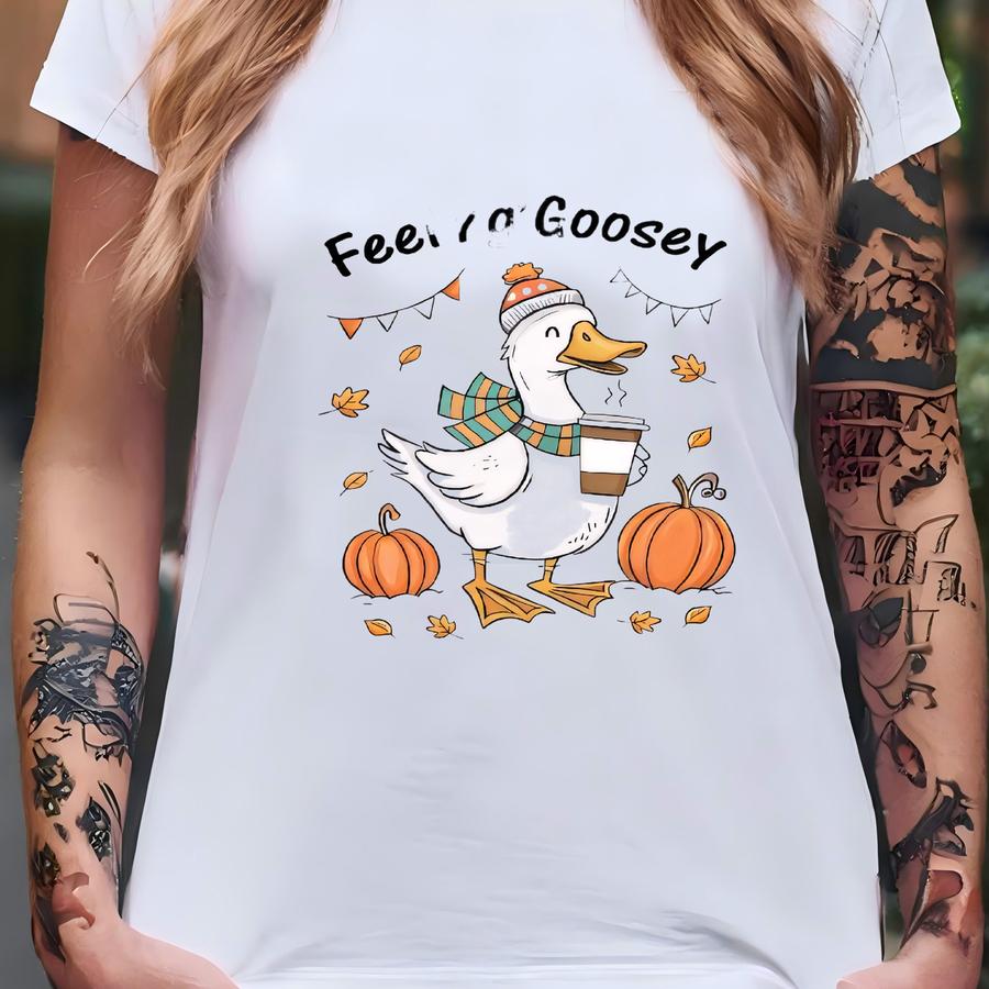 Feeling Goosey Fall Shirt, Funny Cozy Goose With Pumpkin Coffee, Cute Autumn Animal Tees, Fall Gift T-shirt