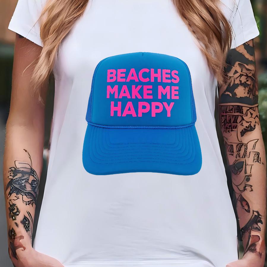 Beaches Make Me Happy Trucker Hat | Summer Vacation Girls Trip Cap | Fun Beach Mesh T-shirt