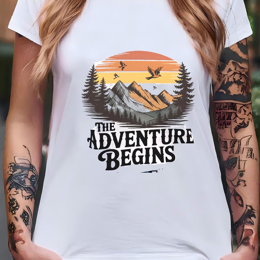 Adventure Begins Crewneck Shirt, Hiking Mountain Sunset Tee, Outdoors Adventure Sweatshirt Hoodie T-shirt