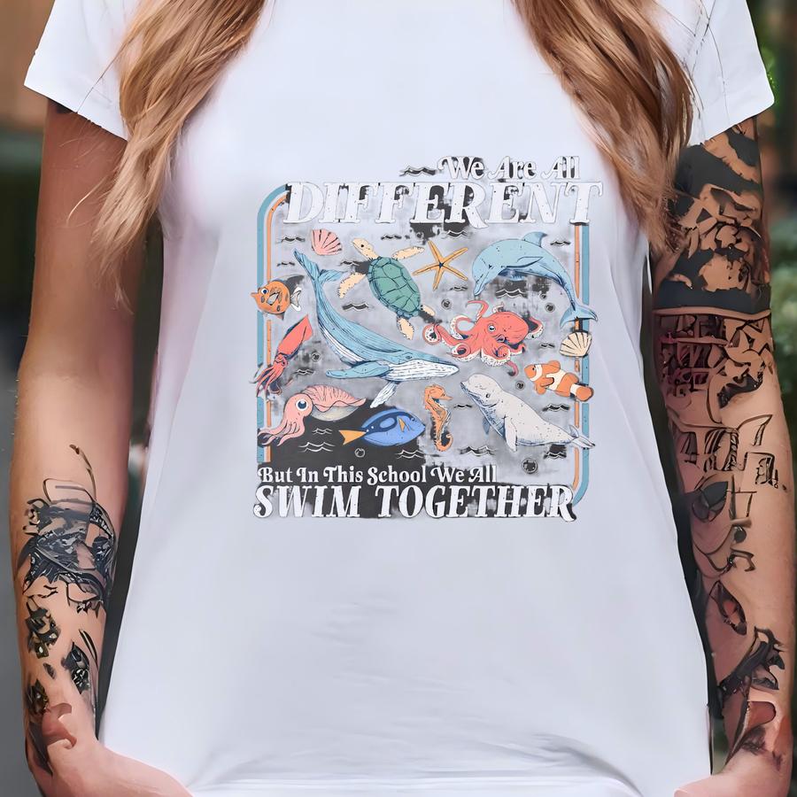We Are All Different Swim Together Shirt, Teacher Hoodie Back To School 2025, Ocean Animals Tee, Teacher Appreciation Shirt T-shirt