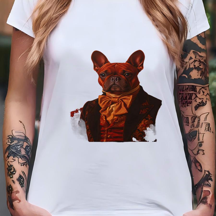 Framed Poster: Dapper French Bulldog, Red Accents, Elegant Outfit, Regal T-shirt
