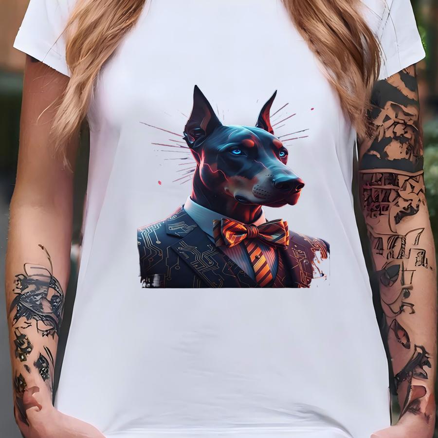 Doberman Framed Poster: Cyberpunk Dog Portrait, Neon Art, Futuristic Style T-shirt