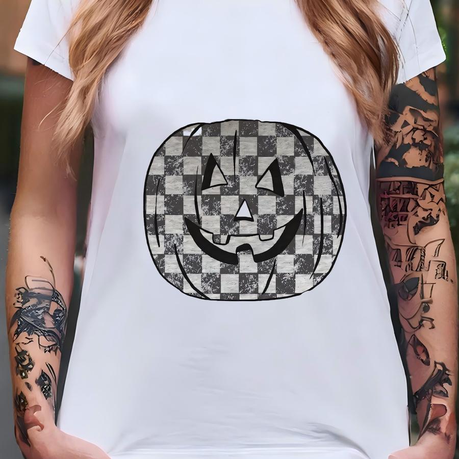 Checkered Halloween Pumpkin Crewneck | Retro Spooky Season Sweatshirt, Spooky Basket Ideas, Halloween Womens Hoodie, Jack-o-lantern Pullover T-shirt