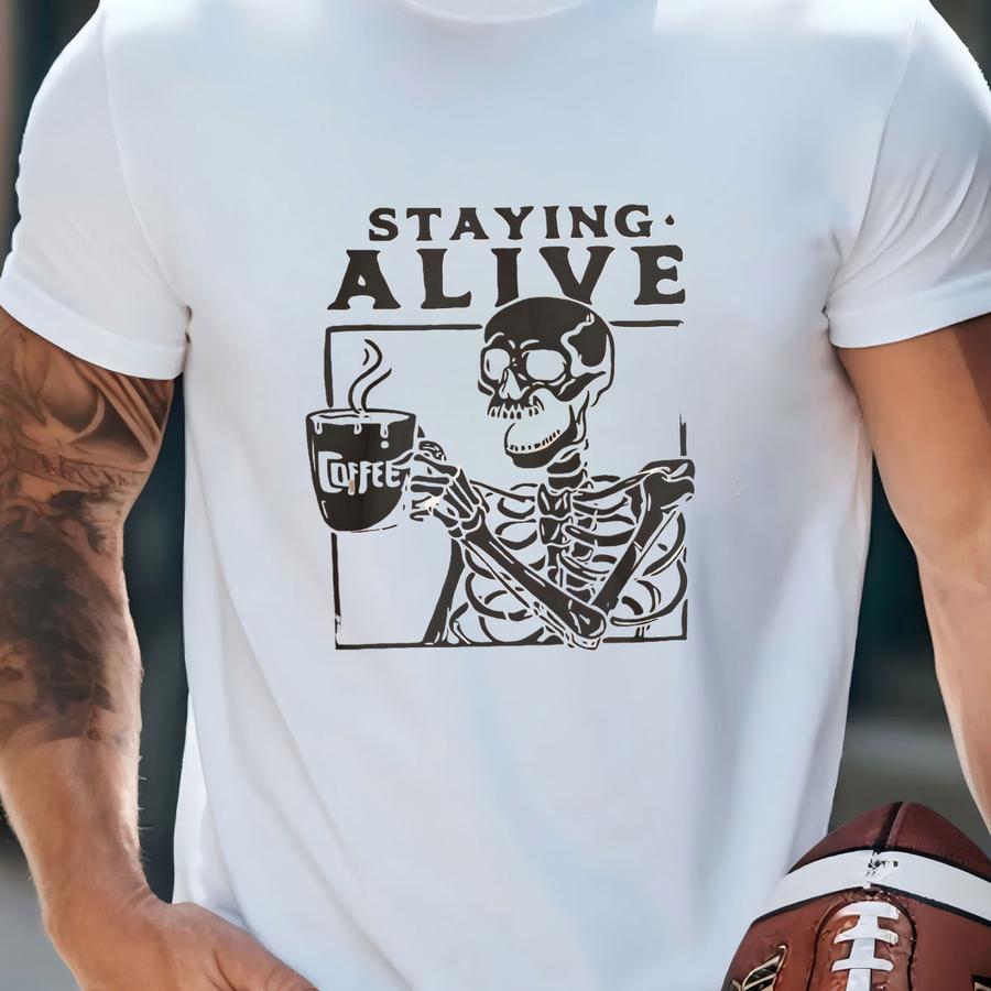 Staying Alive Halloween Sweatshirt Funny Skeleton Crewneck, Party Costume Pullover Sweater Gothic Clothes Spooky Season Vintage Apparel Gift T-shirt