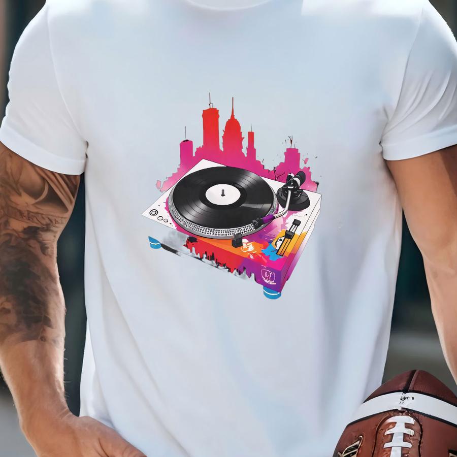 Graffiti Dj Turntable Tee - Unisex Adult Hoodie With City Silhouette Background - Vibrant Street Art Style - Graphic Tee T-shirt