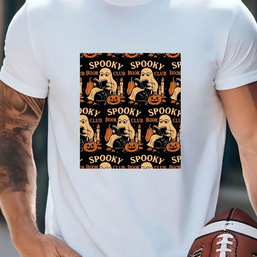 Spooky Book Club Halloween Tee – Ghost Reading A Book With Black Cat Pumpkin | Cotton Canvas Trick Or Treat, Book Lover Gift T-shirt