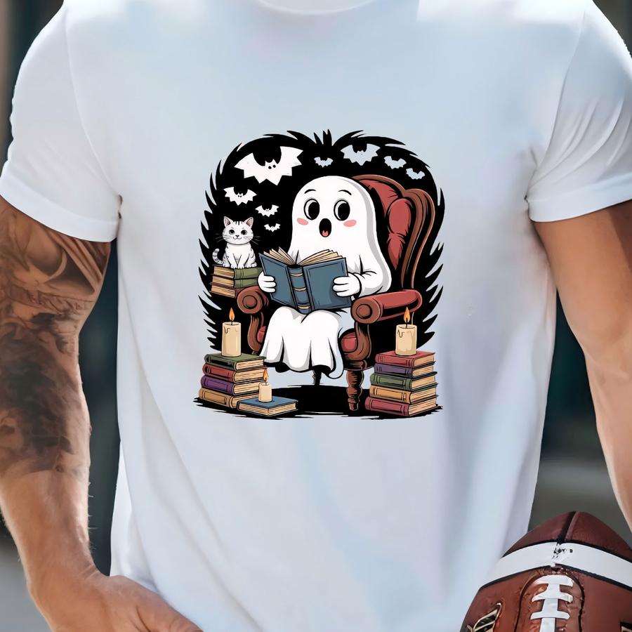 Ghost Reading Book Tee: Spooky Halloween Cotton Canvas T-shirt
