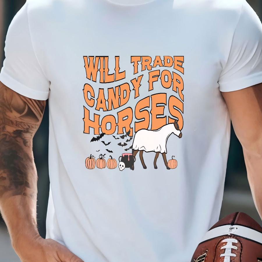 Will Trade Candy Retro Halloween Horse Shirt Spooky Horse Lover Tee Pumpkin Horse Tshirt Horse Owner Gift Youth Ghost Horse Girl Hoodie T-shirt