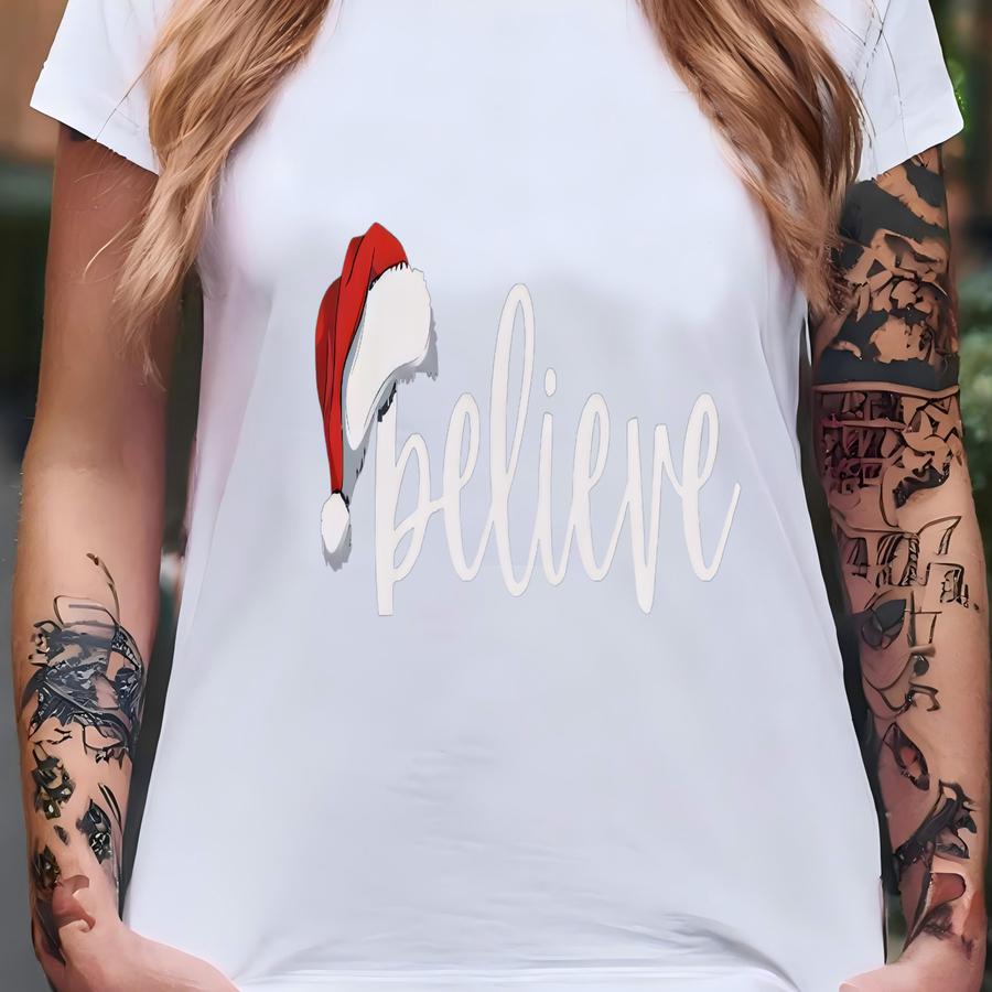 Believe Reusable Tee, Santa Hat, Christmas Morning Magic, Holidays, Santa Claus, Still A Believer, Eco Tee T-shirt
