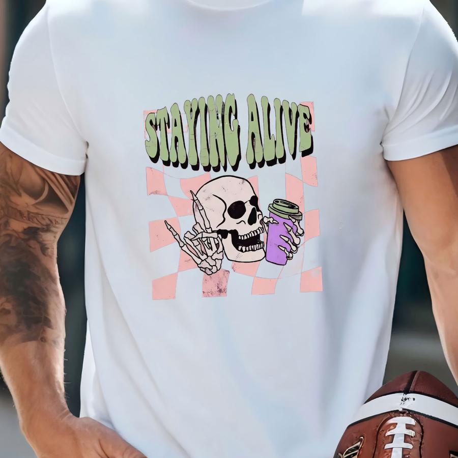 Funny Skeleton Shirt, Staying Alive Shirt, Skeleton Drinking Coffee, ®, Halloween Tee, Funny Halloween, Spooky Vibes T-shirt