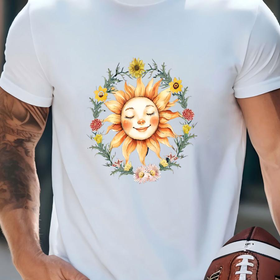 Suower Spiritual Sun Bohemian Fashion Celestial Shirt; Vintage Women Wild Flowers With Floral Outfit Meditation Smiling Face T-shirt
