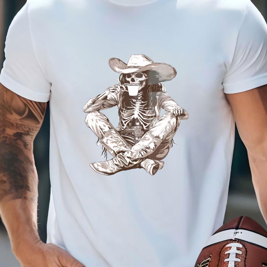 Skeleton Cowgirl Art Print | Retro Cowgirl Drinking Coffee, Bone-a-fide Cowgirl, Large Vintage Cowgirl Wall Art, Gothic Cowgirl Wall Decor T-shirt