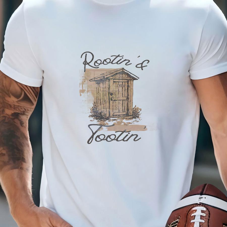 Rootin' And Tootin' Funny Bathroom Wall Art, Western Ranch Bunk House Decor, Cowboy Outhouse Toilet Humor Poster, Rustic Guest Restroom Sign T-shirt