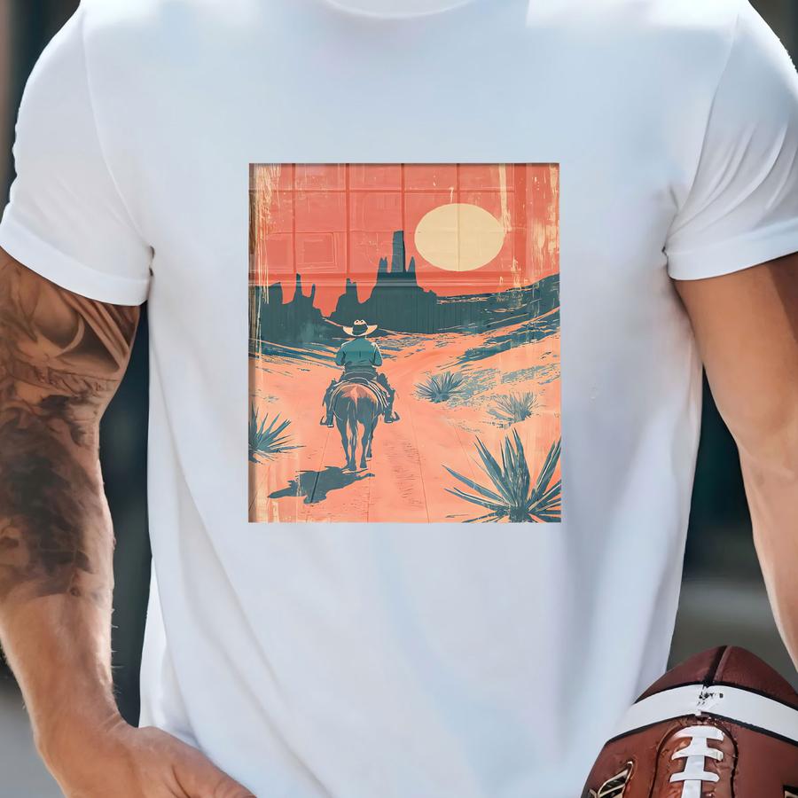 Cowboy Riding A Pack Mule In Southwestern Desert Landscape Sunset Wall Art Print, Vintage Rustic Retro Cowboy Aesthetic, Old West Wall Art T-shirt