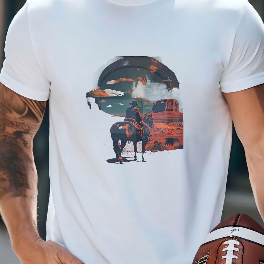 Vintage Cowboy Riding Horse Art Print | Cosmic Cowboy Wall Art, Retro Cowboy Art, Surreal Western Art Print, Southwest Desert Landscape Art T-shirt