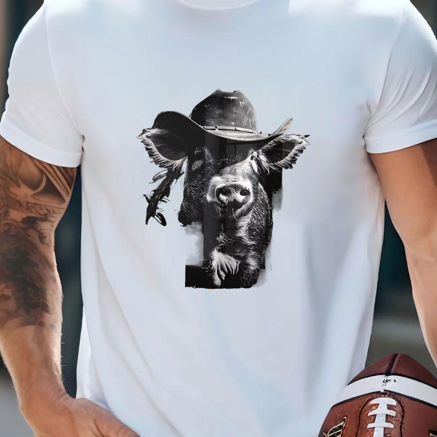 Cute Pig Wearing Cowboy Hat Art Print, Western Farm Animals Print, Large Black And White Western Living Decor, Modern Ranch House Wall Art T-shirt