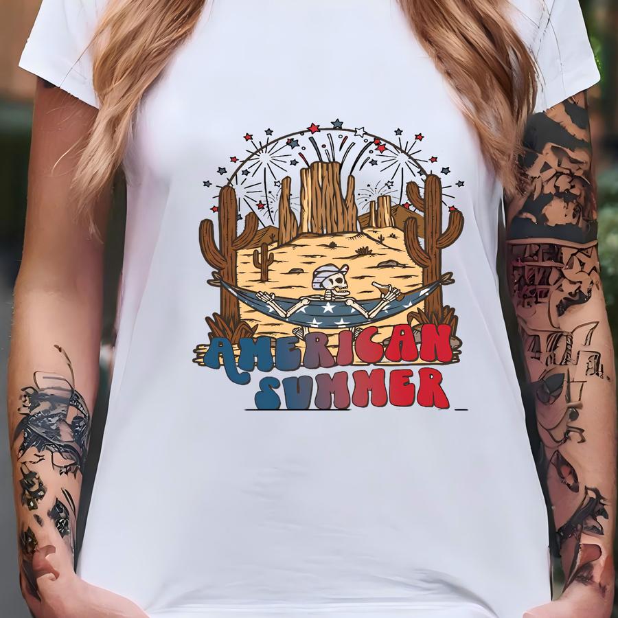 American Summer Shirt – Skeleton In Desert Hammock Hoodie Hoodie Sweatshirt Long Sve Funny Patriotic Western Fourth Of July Gift Skuc 74 T-shirt