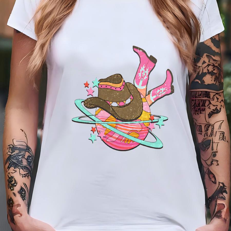 Cowgirl Space Boots Shirt, Pink Western Hoodie, Rodeo Cowgirl Digital Tee, Retro Galaxy Country Graphic, Cowgirl Png – Skuc 18 T-shirt