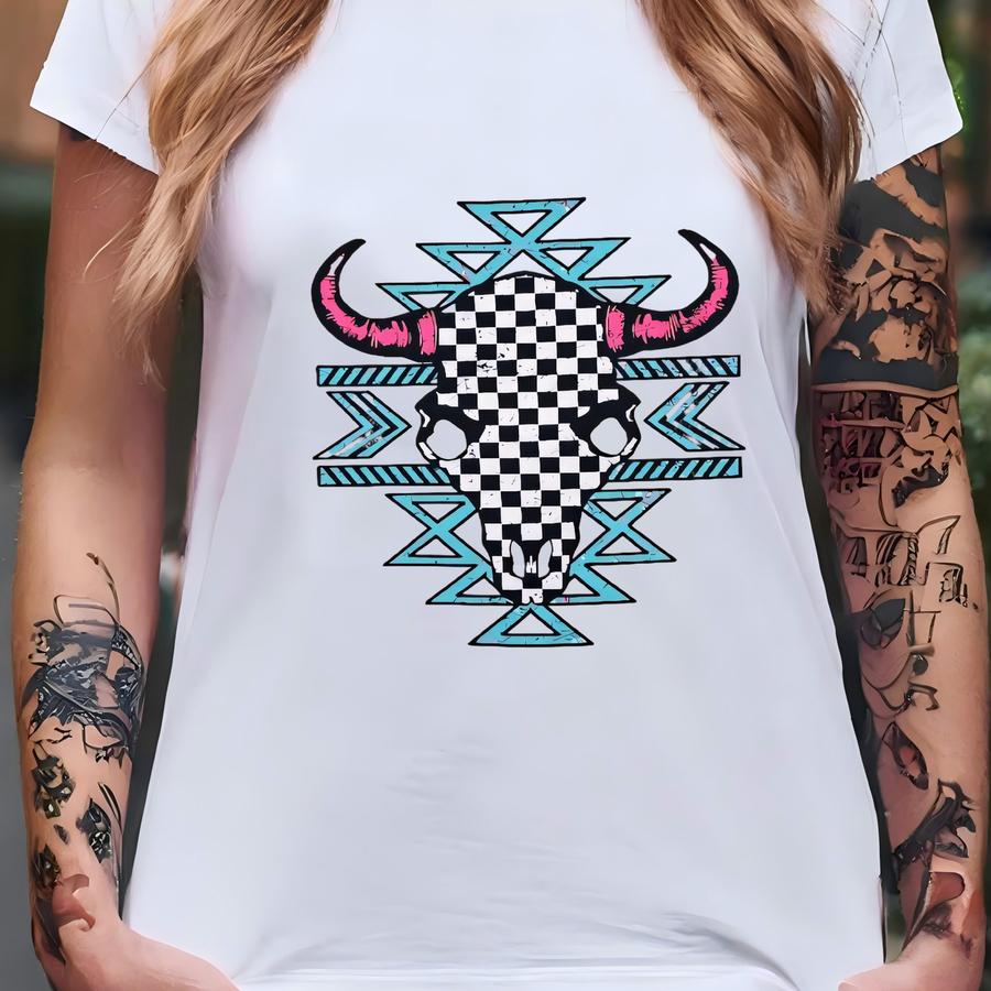 Aztec Cow Skull Graphic Tee – Checkerboard Western Shirt – Boho Desert Cowgirl Outfit – Retro Southwestern Skull Hoodie For Women T-shirt