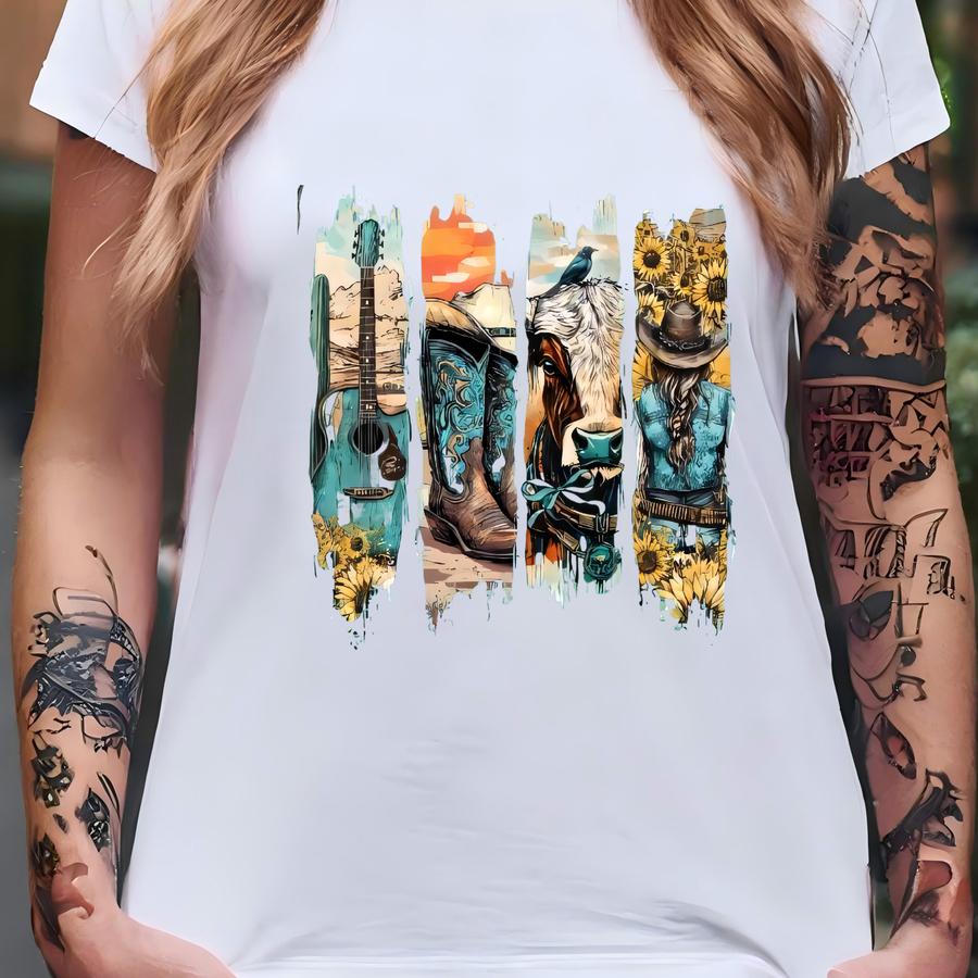Western Suowers And Turquoise Graphic - Bella Canvas Tee, Boots, Bow, Cowgirl, Hat, Belt, Cow, Guitar, Bird, Sunset, Country, Rustic T-shirt