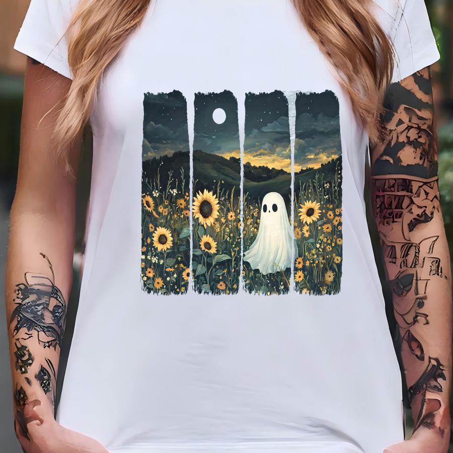 Cute Ghost In Suowers Shirt, A Ghost's Stroll Through Suower Fields, Ghostcore, Cottagecore T-shirt