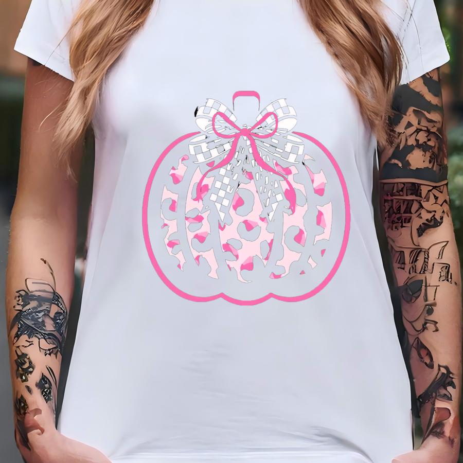 Black, Pink And White Leopard Pumpkin With Bows - Gildan 50/50 Preshrunk Sweatshirt, Fall, Autumn, Pretty, Checkered, Ribbon, Pumpkin Patch T-shirt