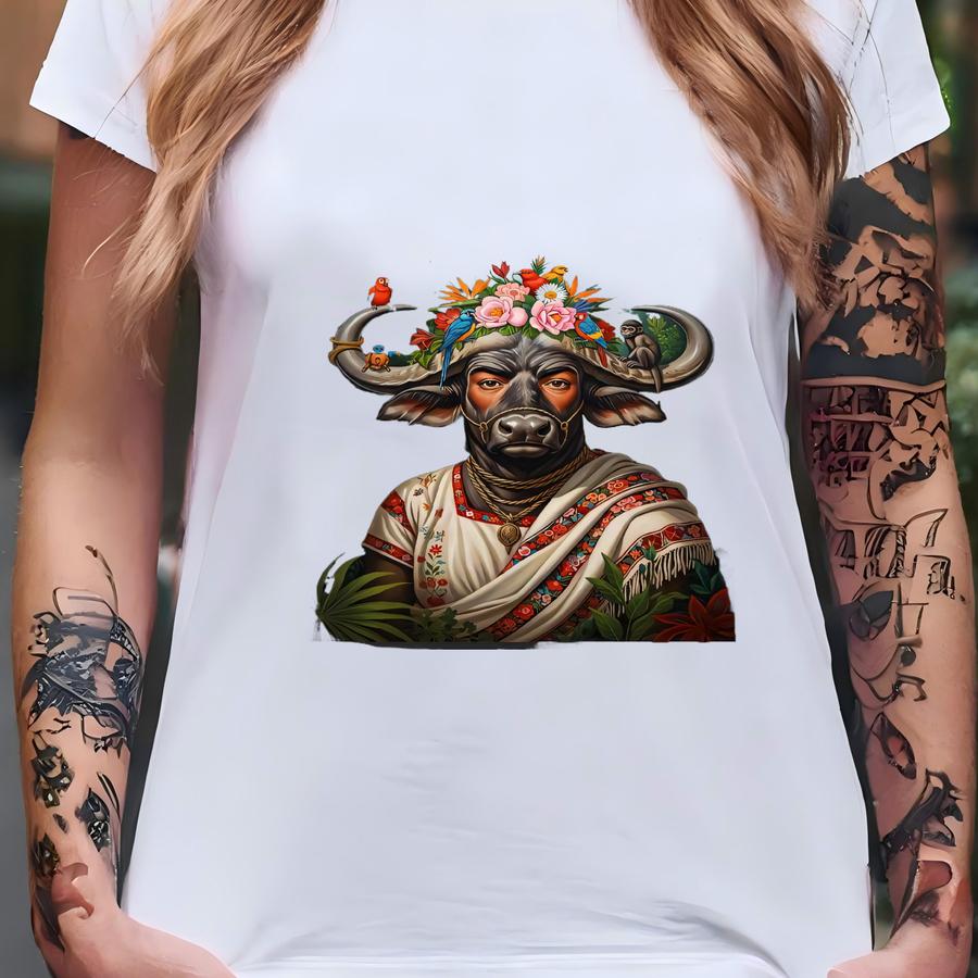 Frida Kahlo Inspired Bull/buffalo Art Print - Folk Art Animal Portrait - Jungle Core Decor - Eclectic Wall Art - 24x36 Rolled Poster T-shirt