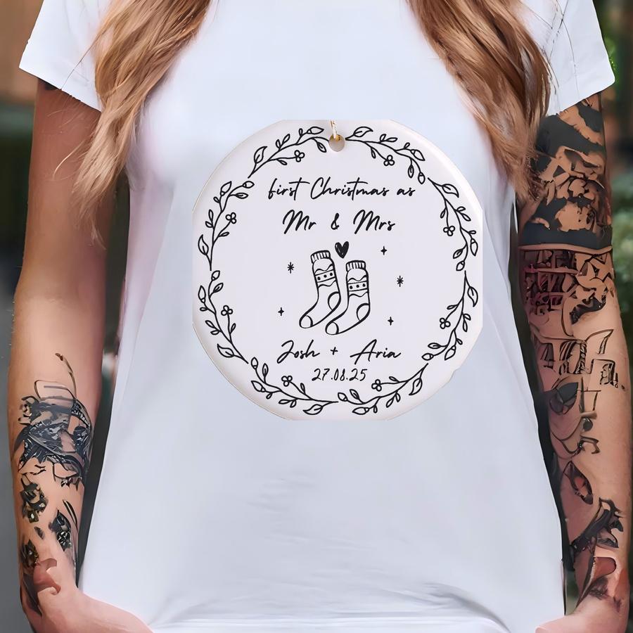 First Christmas Married Ornament, Mr And Mrs Ornament Stockings, Custom Newlywed Ornament, First Christmas As Mr And Mrs, Married Keepsake T-shirt