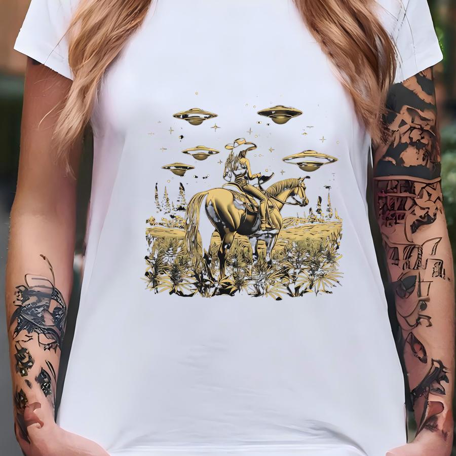 Cowgirl Riding Horse In Cannabis Field Shirt Psychedelic Tshirt Ufo Alien Tee Western Cowgirl Gift Idea Hoodie T-shirt