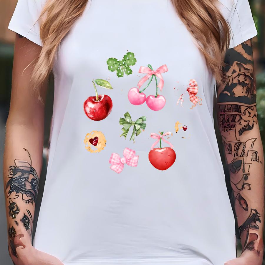 Cherries Tarts And Plaid Bows Drink Ers, Set Of 4, Coffee Lover Gift, Coquette Plaid Bows, Soft Girl Era, Cute Bows And Cherries T-shirt