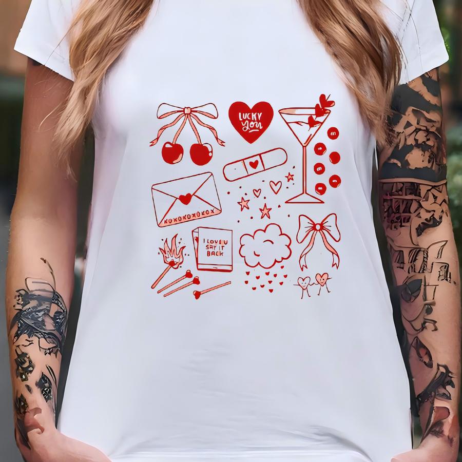 Coquette Cherry Bow Valentine Tote, Lucky You Doodle Canvas With Hearts, Martini Love Icons, Cute Reusable Gift Tote For Her T-shirt