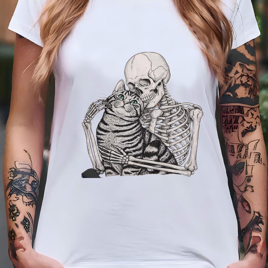 Gothic Skeleton Hugging Cat Shirt - Spooky Halloween Tee T-shirt