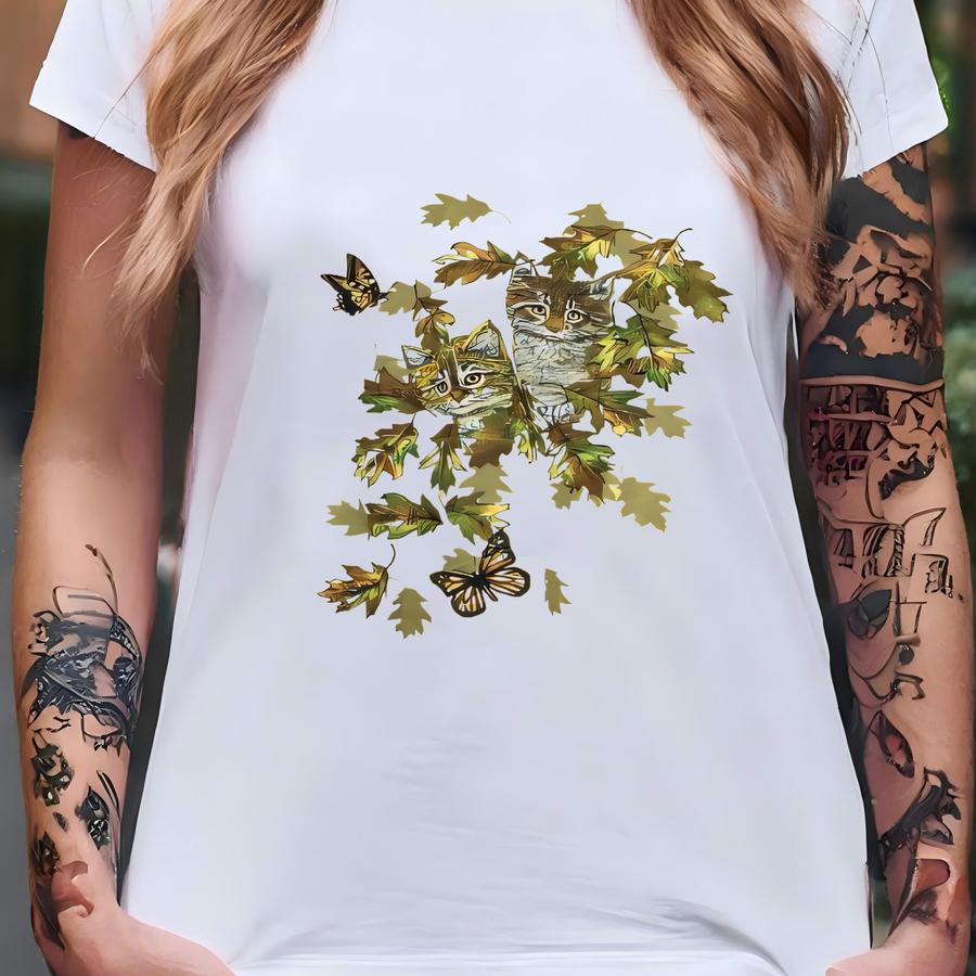 Vintage Cute Cat Kitten Sweatshirt X Cat Kitten Leaves Graphics Print Kitsch Sweater Cat Lover Jumper Cat Butterfly Crewneck Size 2xl T-shirt