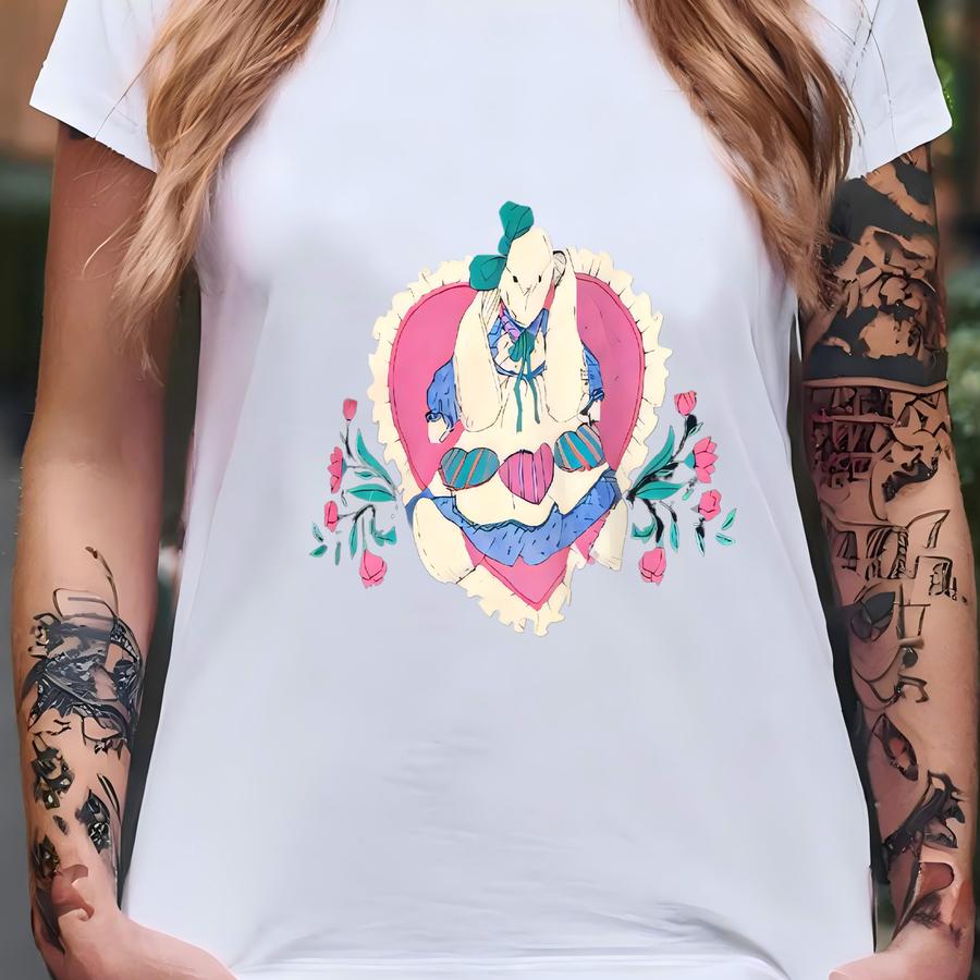 Vintage 90's Rabbit Doll Art Love Sweatshirt Large Bunny Love Flower Artwork Graphic Kitsch Sweater Rabbit Bunny Animal Collared Jumper L T-shirt
