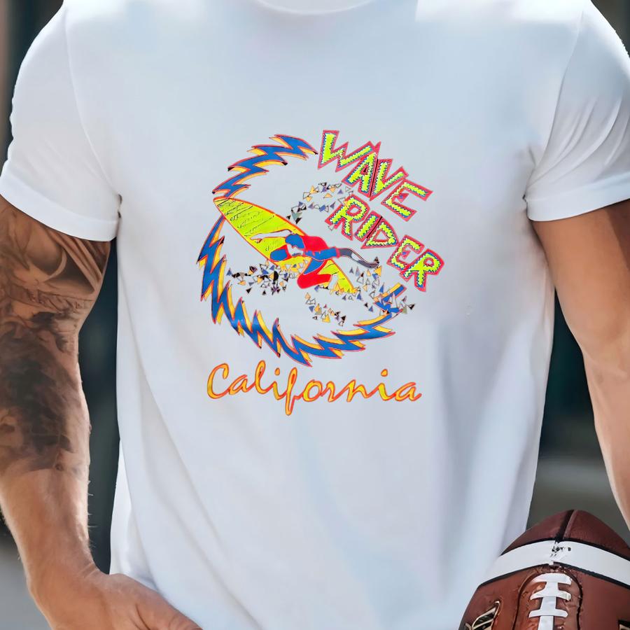 Vintage 1990s Wave Rider California Surfing Neon Graphic Tee Retro Surfer Ocean Art Beach Style Bold Color Print 90s Skate Wave Shirt Size L T-shirt